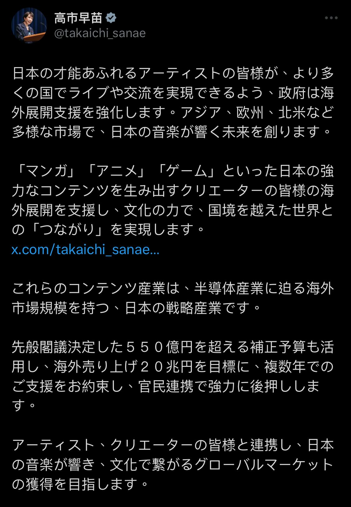 12月9日,《光文社周刊志》报道指出,面对不断扩大的争议,高市早苗日前在社交媒体平台宣布,将动用逾550亿日元补正预算,用以强化日本音乐与文化内容的全球布局,试图以大规模公共投入支撑艺人与文化产业的海外扩展。