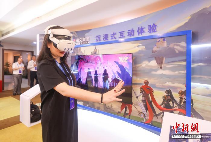 7月17日,第八届中国“网络文学+”大会在北京经济技术开发区举行。图为参会嘉宾在会场外体验VR互动游戏。 中新社记者 贾天勇 摄