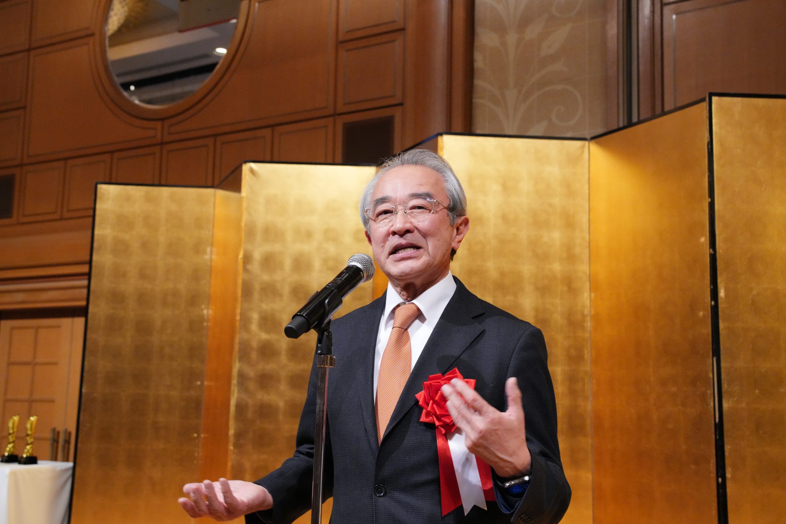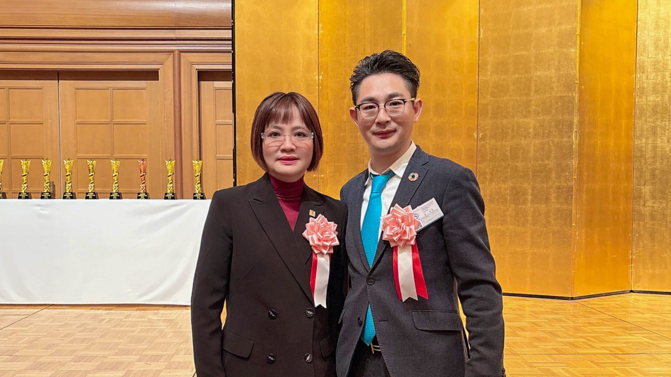 JTM集团向给予企业关心与支持的合作伙伴代表颁发奖杯,日本新华侨通信社社长吴晓乐从山添翔会长手中接过“常年助力企业奖”。