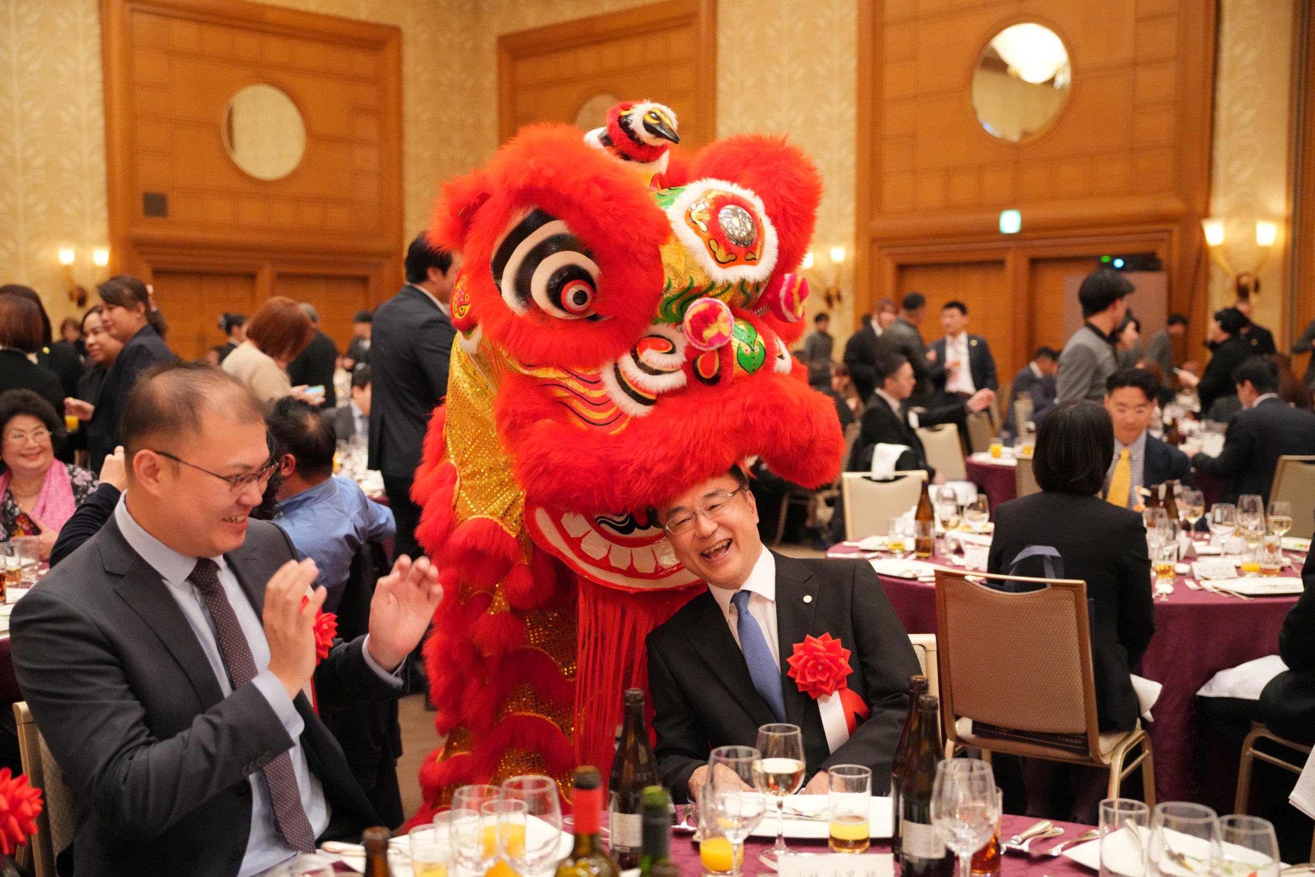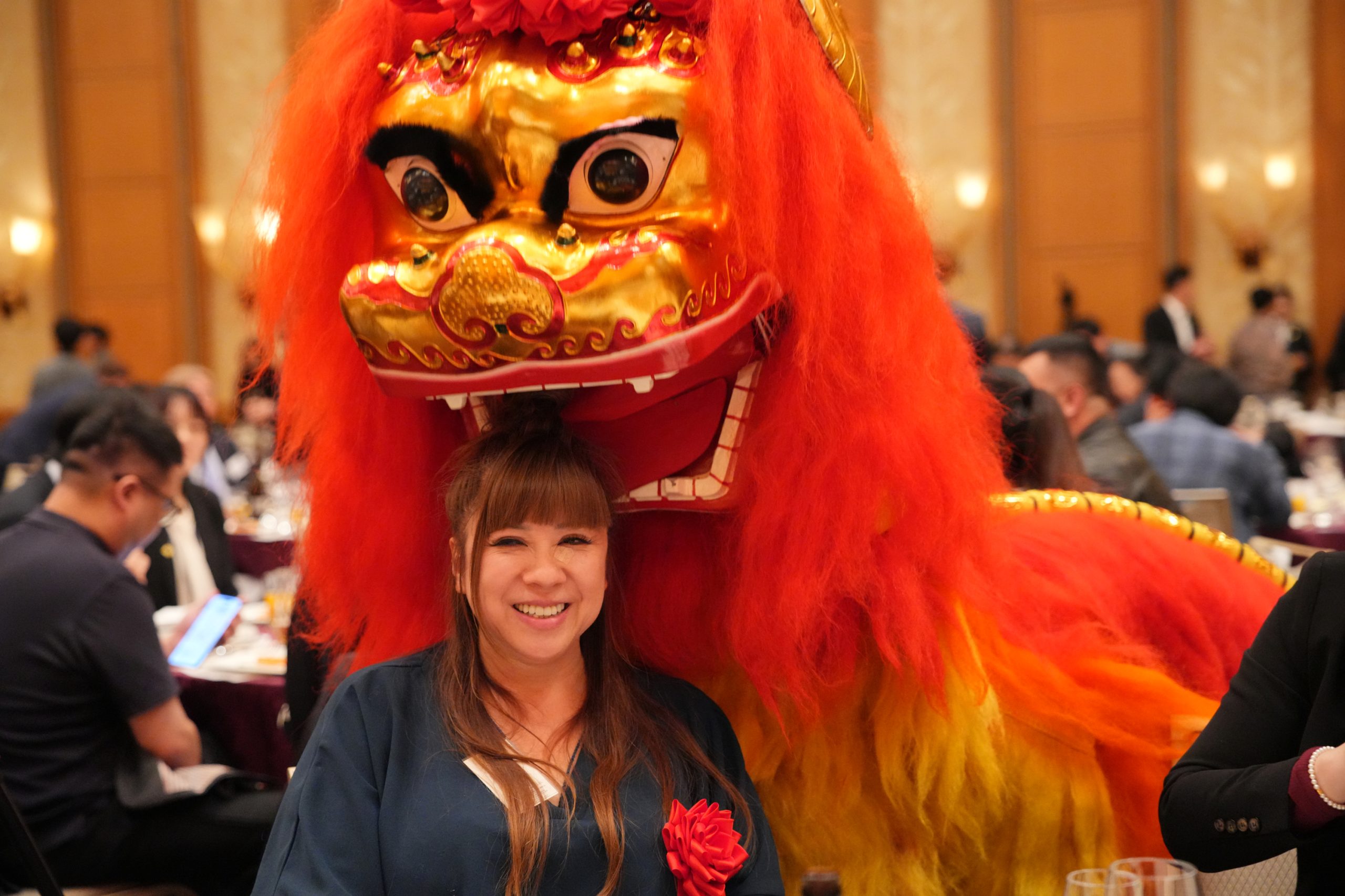 亚洲艺术文化促进会会长王文强率领英姿勃发的中华舞狮团队登场,腾挪跳跃,勇猛精进。舞狮走到每一位宾客身边,送去祝福和欢笑,也将现场的气氛推向又一个高潮。