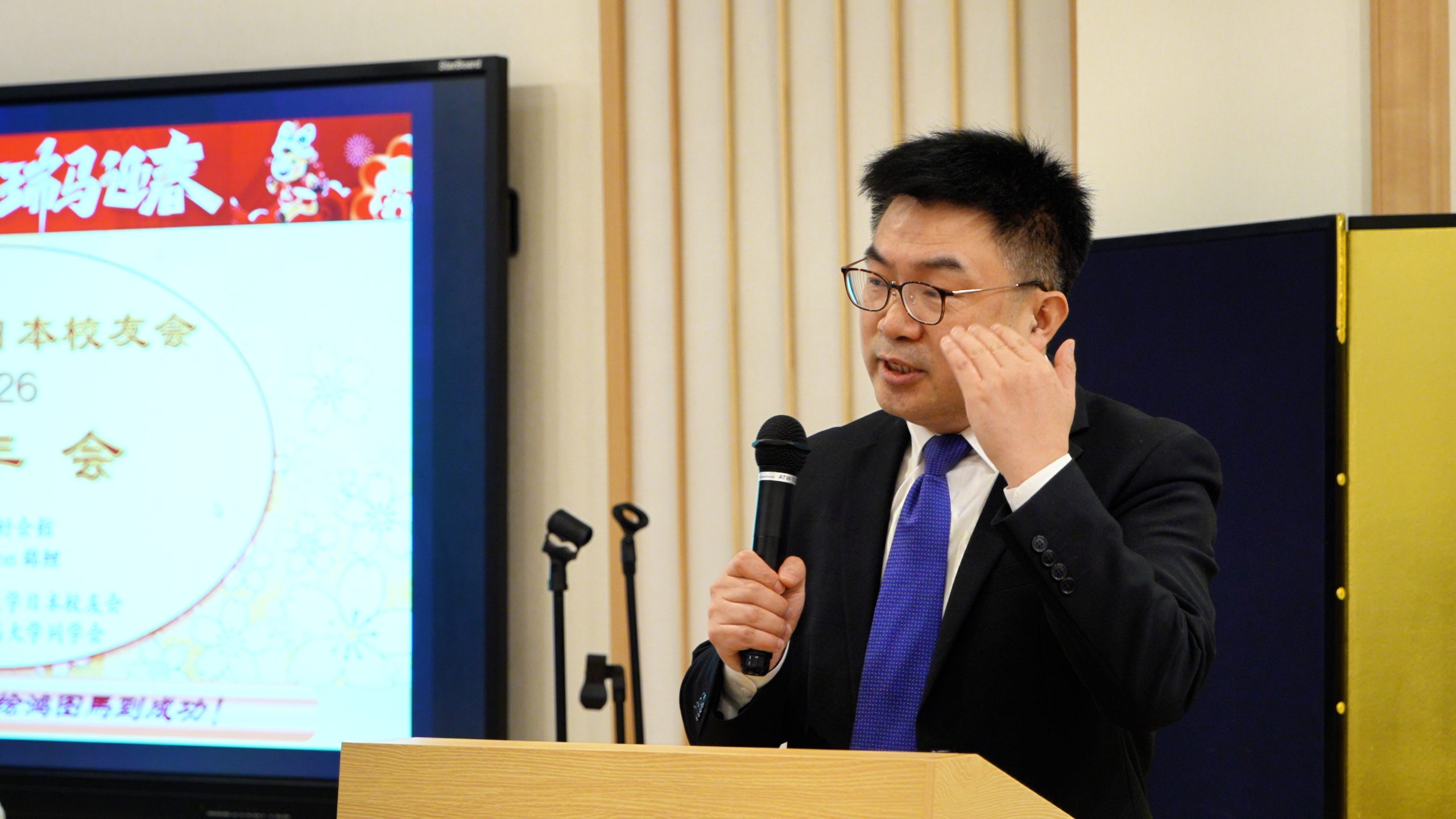 中国驻日本大使馆参赞洪志杰连续两年到场致辞,代表使馆向校友们送上新春祝福,并结合当前形势,强调坚持交流合作、增进相互理解的重要意义。他还分享了对中国科技发展和经济前景的观察,鼓励在日校友坚定信心、积极作为。