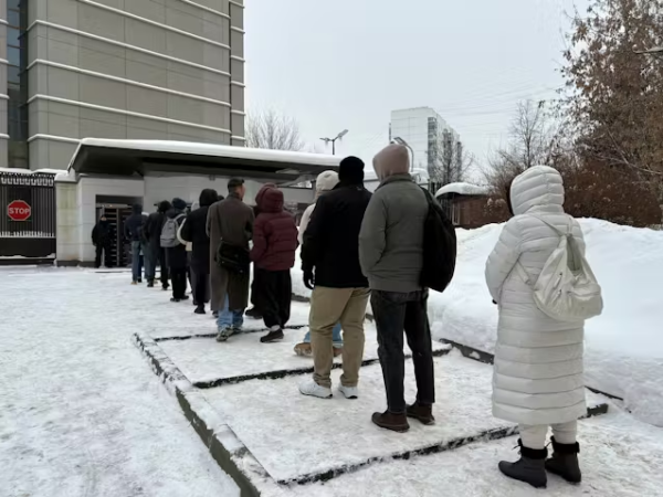 1月15日,共同社记者在日本驻俄罗斯大使馆拍摄的照片显示,在签证中心当日开放办公前,就已经有50多名申请签证者排起长队,零下10度的严寒和遍地的积雪,并不能阻挡人们的热情。