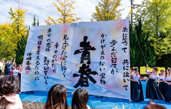 群马县清明高中书法部的女生现场挥毫疾笔,用“青春”点明“千辉祭”活动的主题。“一起哭、一起笑,共同度过的时光是千金不换的珍宝”,诗一样的语言,音符般美妙的字体,赢得现场观众的共鸣。