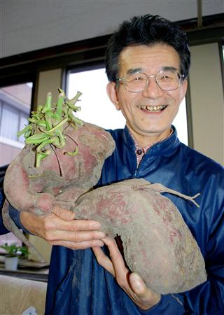 日本兵库县伊丹市的70岁老人森川裕夫日前在自家菜园中收获了一根长约45厘米,重达6.8公斤的超大红薯。红薯从正中间开始逐渐变细并弯曲,形状酷似一个伸脚坐着的人。