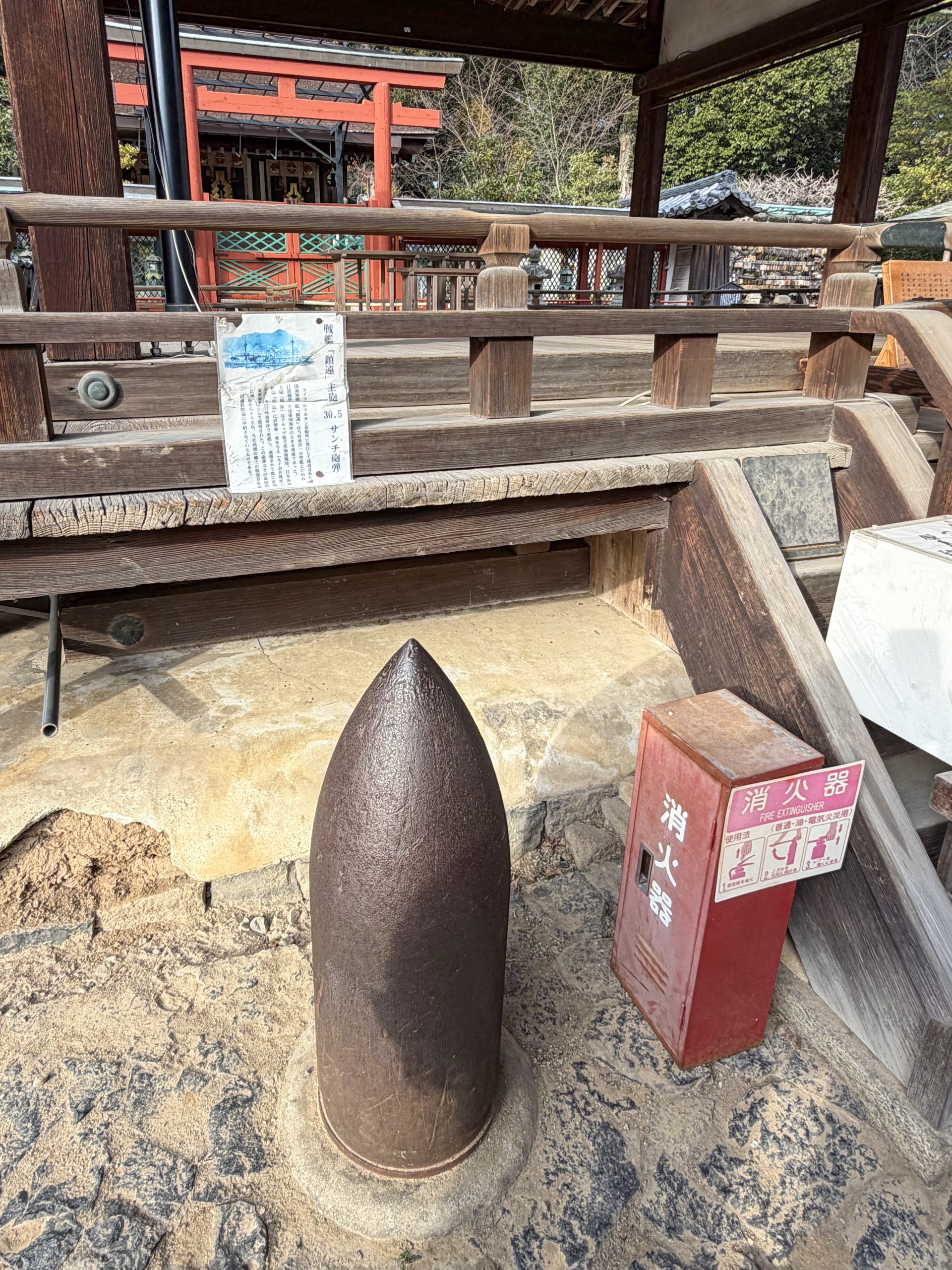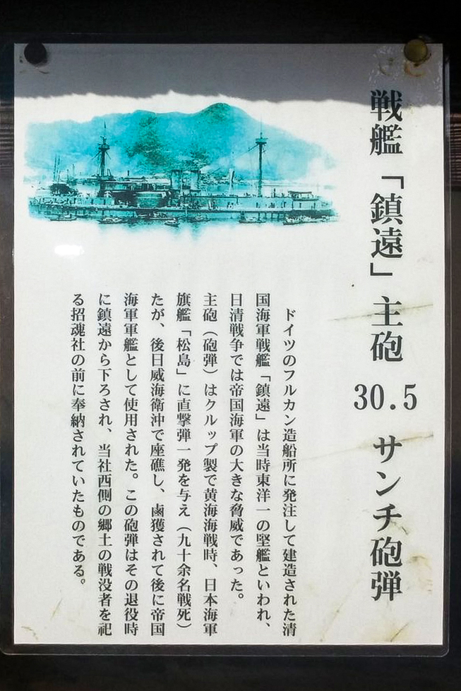 其实,历史的路径并不复杂,却充满意味。北洋水师威海卫失守之后,镇远舰被日军俘获,编入日本海军继续服役。多年之后退役,舰上的部分器物被拆卸下来,作为“战利品”分散保存。有的进入博物馆,有的进入军港,有的——像这一枚——被送入神社。据说,这里当年还建立了一座“招魂社”,特意把这枚炮弹运载到这里,祭祀在战争中死去的日本西南地区的军人。