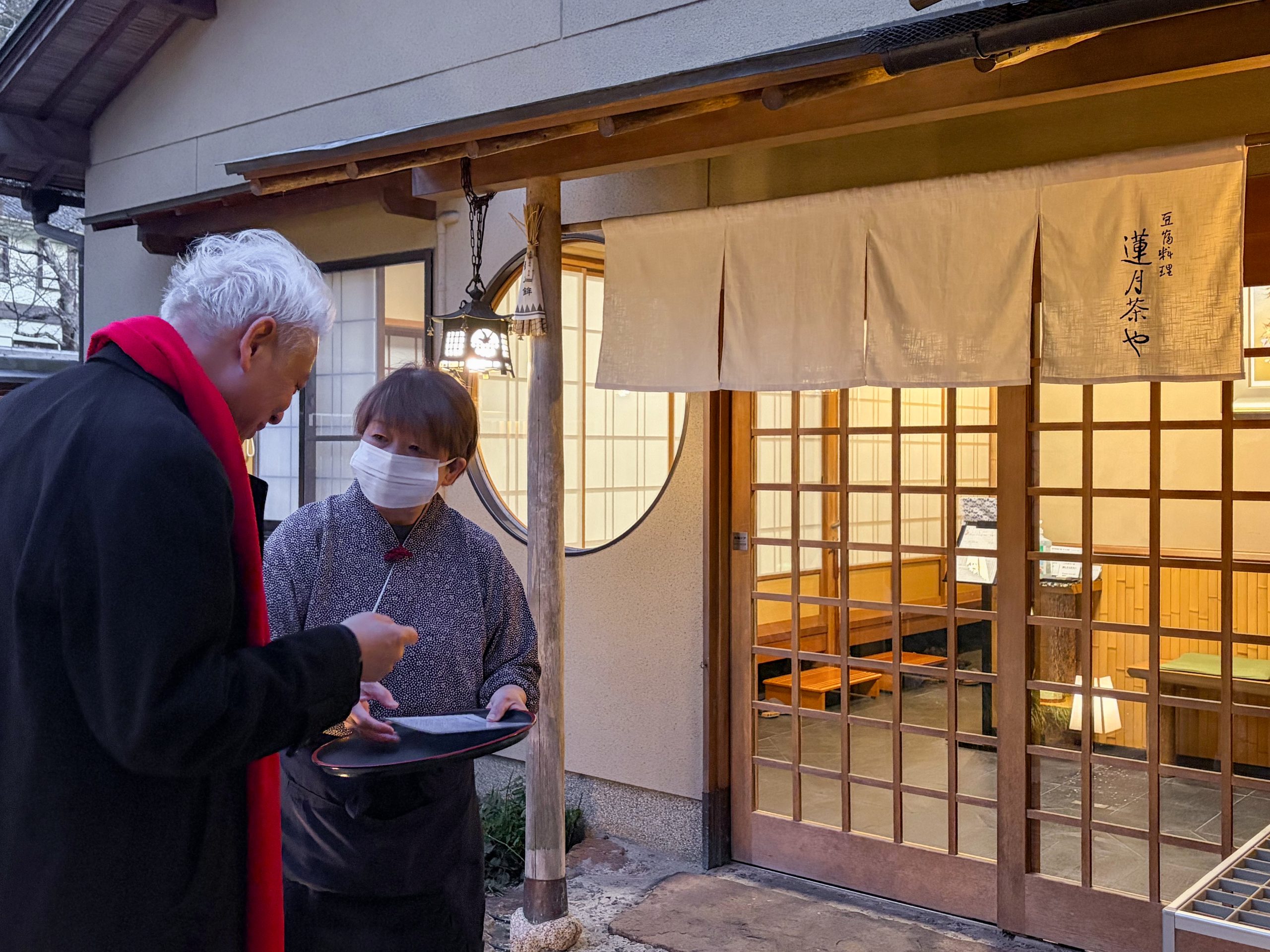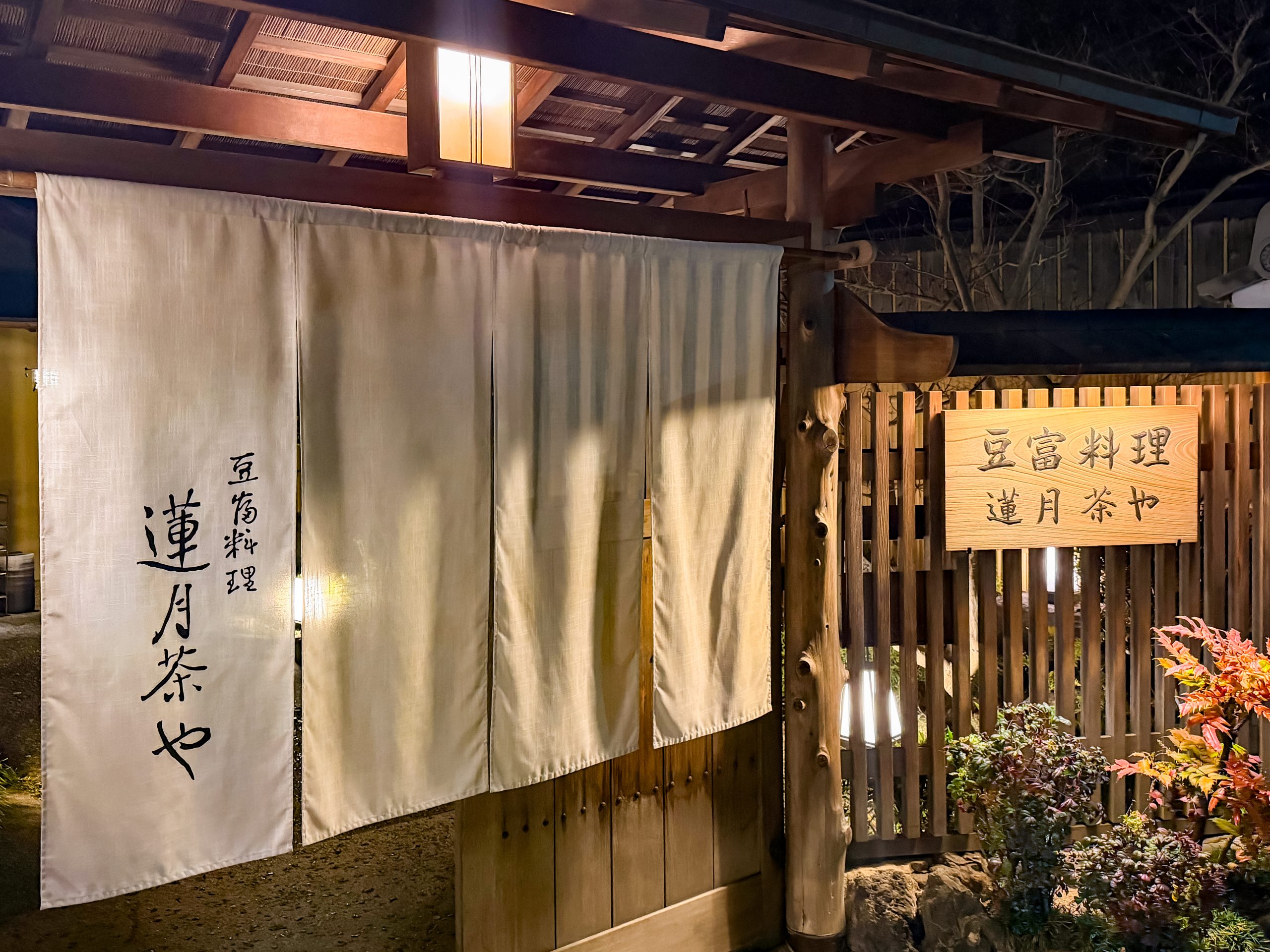抵达京都时,暮色正如同淡墨,一层层洇染过来。我们下榻在东山区,安置好简单的行李,便信步向山麓走去。暮色里的东山,像一幅正在收笔的宋代水墨,所有的轮廓都柔和了,沉静了。知恩院那巍峨的三门,此刻不再是精雕细刻的建筑,而化为一座浑然天成的黑色山岳,沉默地镇守在渐浓的夜色边缘,散发出宗教般的肃穆与威严。就在这庞大的阴影一角,几株不知历经几朝风雨的参天古木掩映下,一点昏黄的光,怯生生地,却又执拗地亮了起来。走近了看,那是一盏石灯笼,灯罩上刻着“莲月茶屋”四字。那光不是亮堂的,是朦朦的、温润的,像深秋将熄的炭火,也像古画中佛陀低垂的眼眸里流露出的,那种近乎慈悲的暖意。灯笼旁,一块木招牌在微光中显现,“豆富料理”——就是这简单的四个字,像一枚钩子,瞬间挂住了我们这些异乡人的脚步。