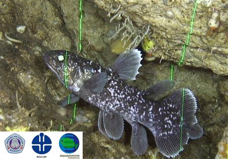 日本调查队在印度尼西亚苏拉威西岛北部海域成功拍摄到的空棘鱼幼鱼,图中的绿线为测量鱼身长度的激光。
