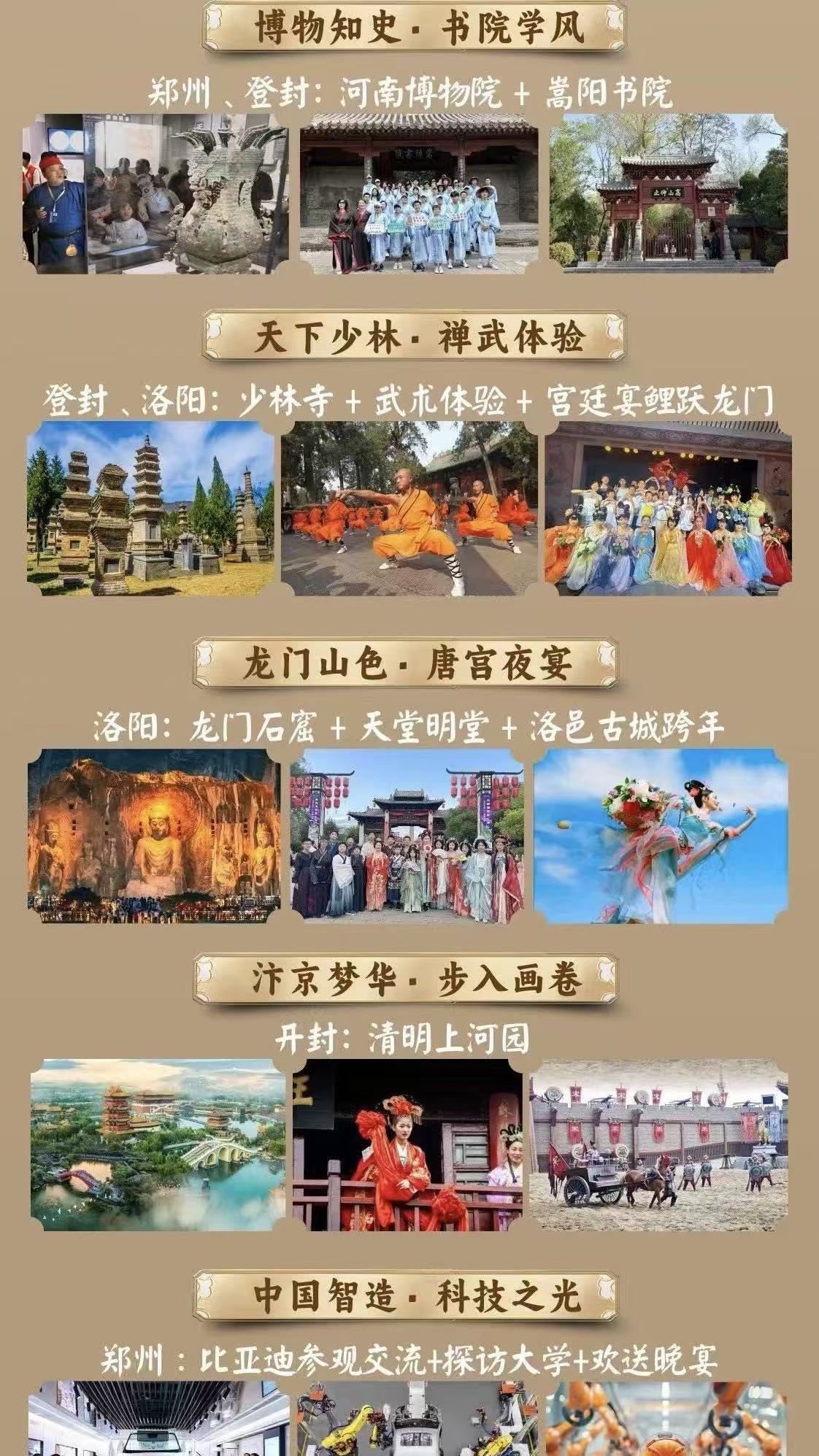 本次营程主要内容包括:在郑州、登封,同学们将走进河南博物院与嵩阳书院,在文物与典籍之间理解中华文明的历史纵深,在书院空间中体会中国传统学术精神与文化传承的基本形态;在少林寺体验禅武文化,通过基础武术训练与文化讲解,理解“止戈为武”背后的东方智慧与身心观;在洛阳探访龙门石窟、天堂明堂,感受盛唐时期政治、宗教与艺术高度融合的文明景观,并通过沉浸式体验,直观感知千年古都的格局与气象;在开封走进清明上河园,于宋代城市生活的复原场景中,体会中国古代社会的市井结构、经济活力与审美秩序;在郑州参访高校与科技企业,了解当代中国在科技创新与产业发展领域的实践成果,感知中华文明在现代语境中的延续与更新。