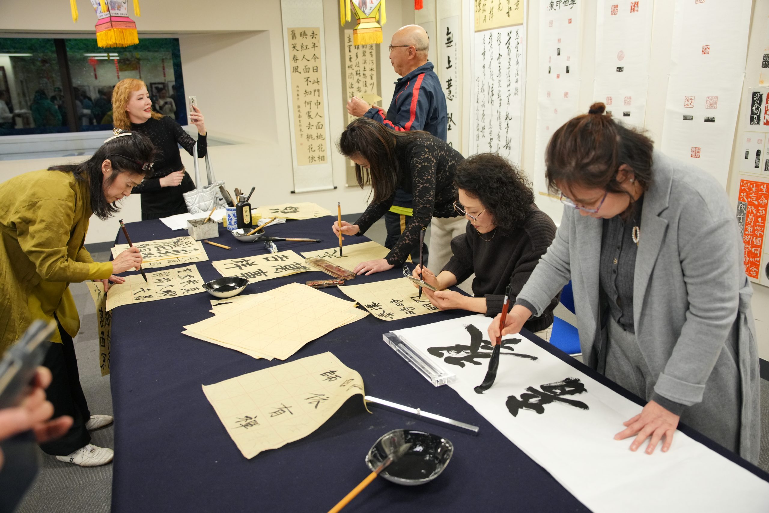 在日女性书法家现场挥毫,与观众交流创作心得,共度元宵佳节。主办方还准备了节日美食汤圆款待四方宾朋,墨香与芝麻融为一体,相得益彰,和美团圆。