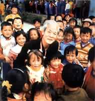 林同春回家乡捐赠学校,并与家乡儿童在一起