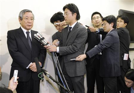 日本航空公司社长西松遥在东京出席企业养老年削减方案说明会后接受媒体采访。
