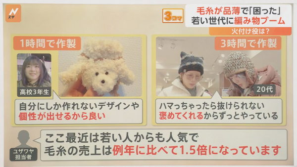 从日本媒体披露的数据来看,这股“编み活”的热潮已经持续有段时间了。东京新宿那家全日本最大的毛线专卖店,2025年的毛线销售额比2023年增长了约6倍,比2024年也增加了一倍。针对初学者的编织套装的客户购买量增长了11倍。