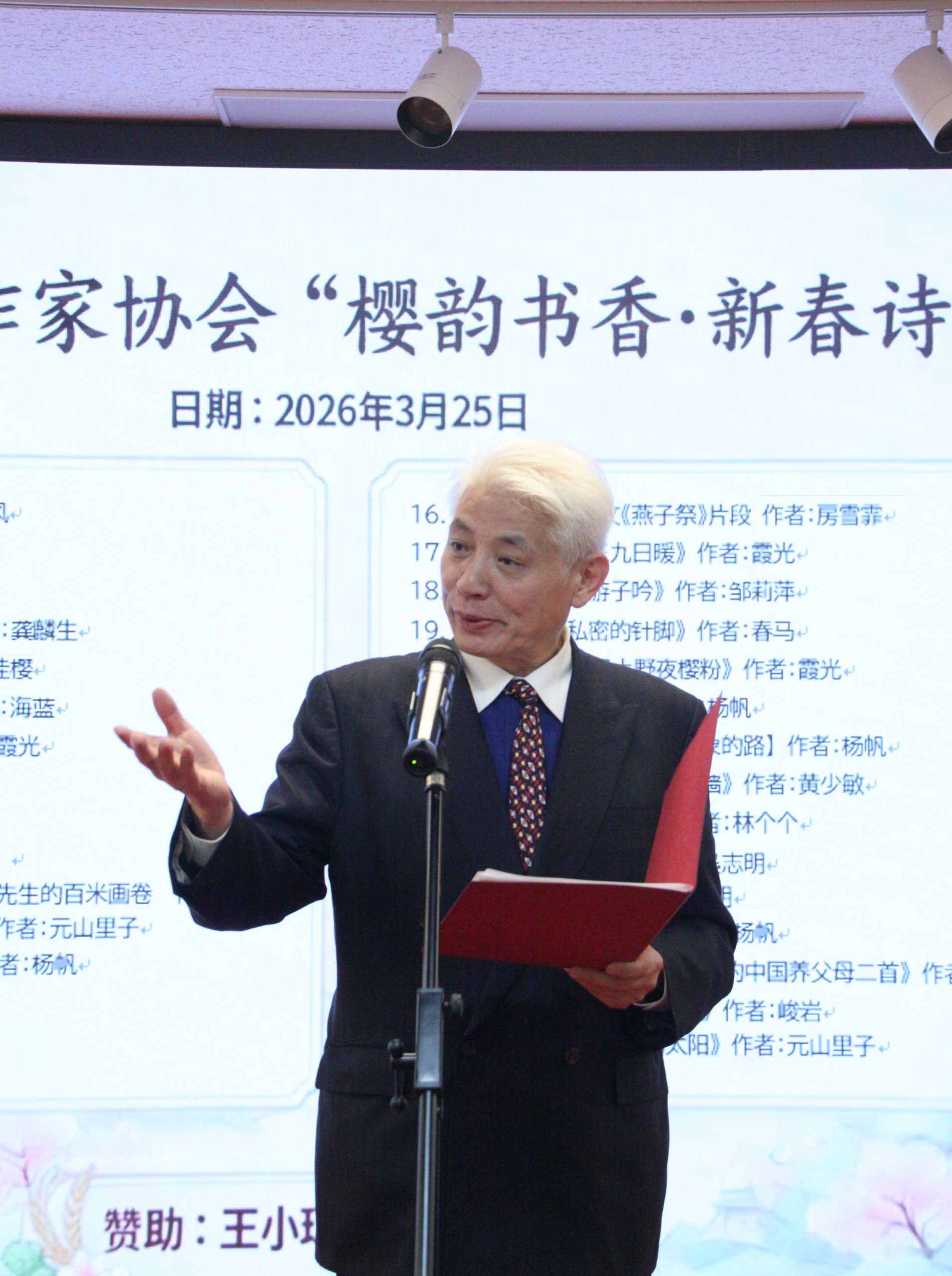 当我再次回想起3月25日东京中国文化中心的春夜里朗诵这一幕时,脑海里最先浮现的,并不是“紫霞仙巅”、“悬葫”、“蜂窠”“星河”这些绚丽意象,而是一个人在时代深处逆风前行的背影。日本华文作家协会“樱韵书香·新春诗会”上,我朗诵这首金蔚为我“量身定做”的新诗时,现场许多人被结尾那句“孤身一人饮马出蓬城”深深打动。