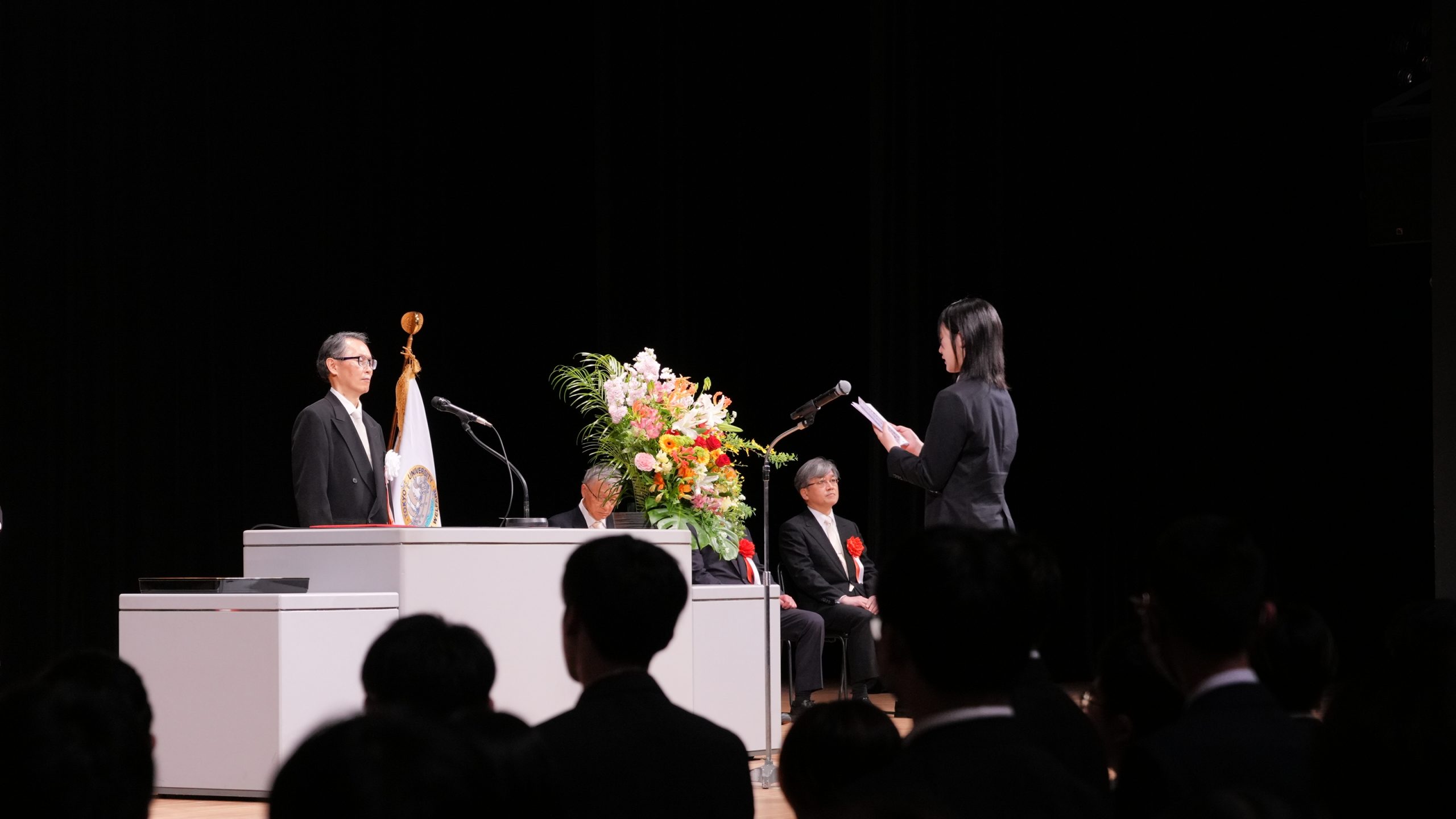 主持人代读伊势崎市市长臂泰雄的贺电。东京福祉大学伊势崎校区所在的伊势崎市,自古就以缫丝闻名,近代又汇集运输及发电设备的制造商,成为一座制造业重镇。随着高速路网的发展,伊势崎与东京都的人员、商贸、物流交流频密,激发出巨大的经济动能。东京福祉大学是一所与时俱进、重视培养学生实践能力的高校,祝愿新同学不断进取,度过有意义的大学时光。