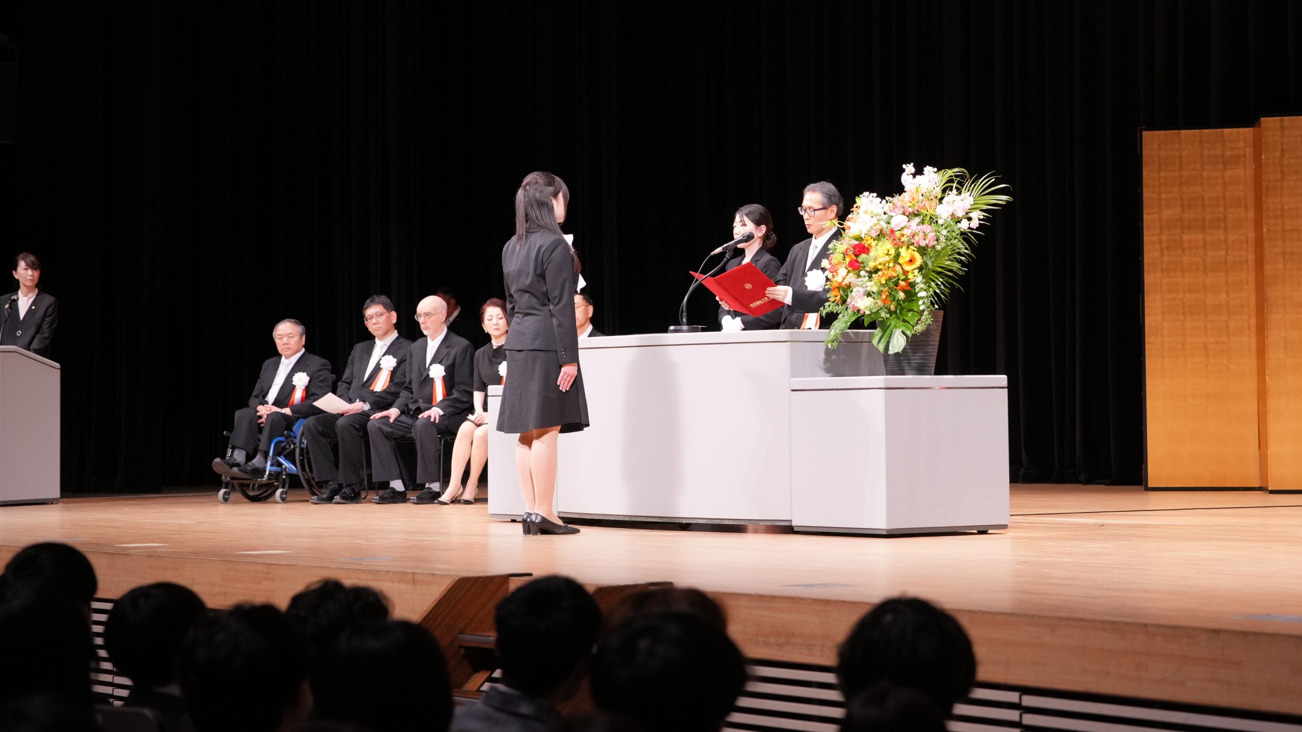 社会福祉学部社会福祉专业介护福祉方向的宇田同学作为新生代表宣读誓词。“能够与同学积极互动、正向交流的学习氛围”“细致周全的教学支援体系”,是吸引她报考东京福祉大学的主要原因。学校环境优美,设施齐全,希望在校期间用好这些资源,充实自己的实力。