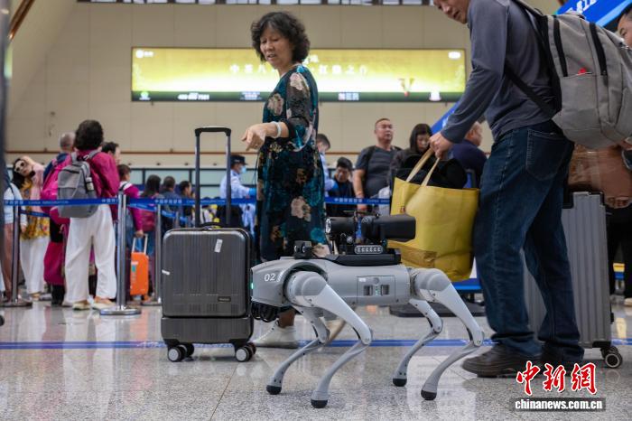智能机器狗在磨憨铁路口岸出境大厅内开展巡逻警戒作业。卫海林 摄