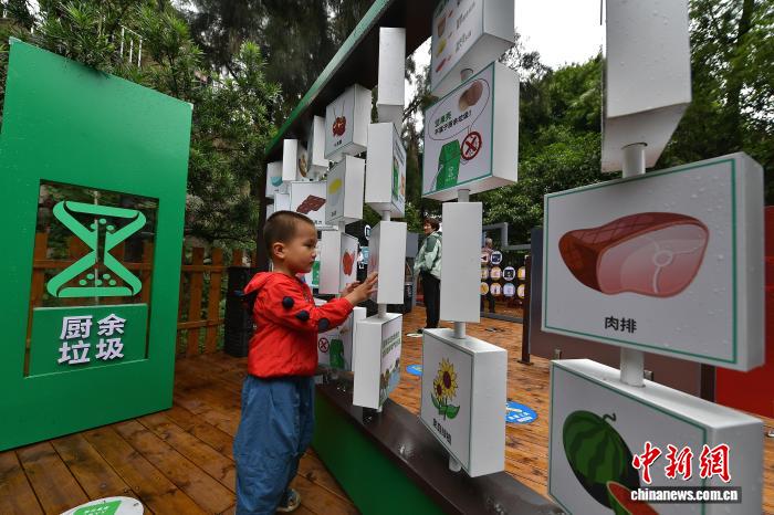 2024年5月13日,福州烟台山垃圾分类主题公园内,一位小朋友在科普空间“厨余垃圾翻翻乐”前了解垃圾分类知识。中新网记者 张斌 摄