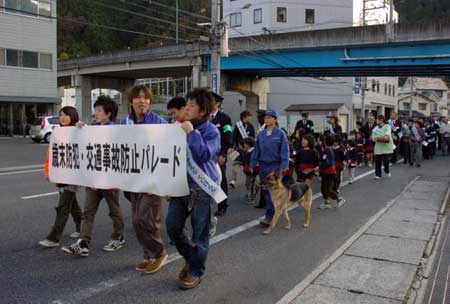 游行队伍在高梁警察署停车场举行出发仪式,担任“一日署长”的吉备国际大学中国留学生罗言南按照日本警界的习俗,对参加游行的民众发出“训辞”:“我们应该共同打造一个让居民没有受害之忧的地域,共同营造一个让居民内心轻松充实的地域,因此我呼吁大家积极参加这次游行。”