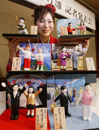 12月10日,日本埼玉市一家名为“东玉”的人偶厂商按惯例发布了一年一度的6款盘点全年大事的趣味人偶。该公司通过公开征集意见,最终从5092封来信中选出6个题材制成人偶。其中得票最多的是“政权更迭 友爱星人”人偶,设计为鸠山由纪夫首相和鸠山幸夫人在UFO前一起欢呼万岁的样子。