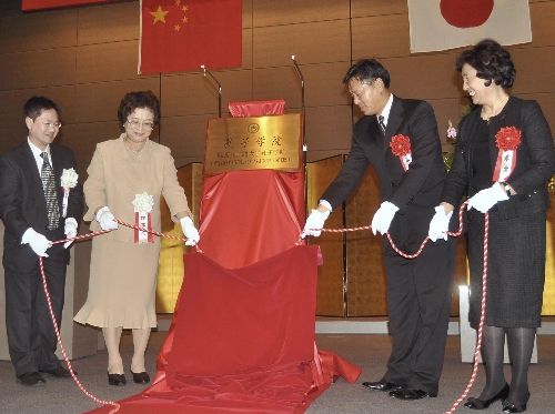 关西外国语大学的谷本荣子理事长(左起第二人)为“孔子学院”校牌揭幕。(日本新华侨报网图片)