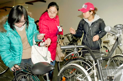 在服务项目的启动仪式上,14名分别来自中国、越南和印度尼西亚的留学生来到活动现场。平和文化中心的工作人员们在启动仪式上搞了个别出心裁的游戏,特意请这些留学生们从事先准备好的30辆自行车中,分别按照型号和颜色各选出一辆最受欢迎的车。