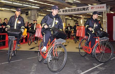 位于东京都中央区日本桥的邮政事业株式会社日本桥支店1月1日早晨举办了贺年明信片的投递出发仪式。骑着红色自行车和摩托车的约50名职员在寒天里,精神焕发地驶向新年的大街。