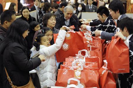 三越百货日本桥总店摆出了装有服装、日常用品的5万个“福袋”。开始营业前店门口就有约8千名顾客排起了长队。在众多促销商品中,装有羽绒服、毛衣等标价1.05万日元的“福袋”很受欢迎。1200个“福袋”仅在上午就售出了大部分。