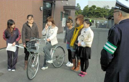 六名在三丰市日本企业工作的中国女实习生在三丰警署警员的耐心指导下,