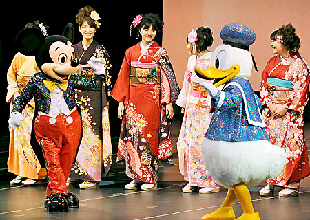 1月11日是今年日本的成人节,千叶县浦安市的成人仪式当天在位于该市的东京迪士尼乐园举行,米奇和米妮等卡通明星为步入20岁的年轻人送上了祝福。