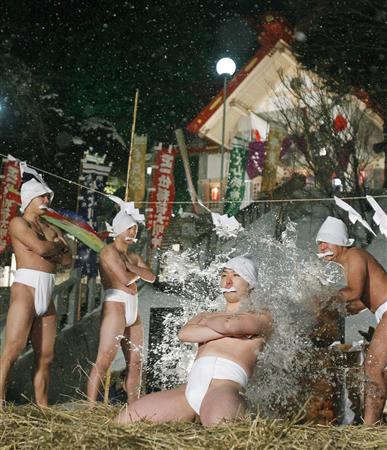 4人当晚寄宿在神社大殿内,每隔几小时便重复冷水修行。15日这些修行者将跳入冰冷的海水中,为4座木制神像去污后结束仪式。