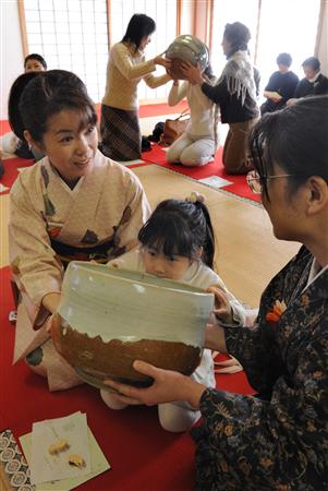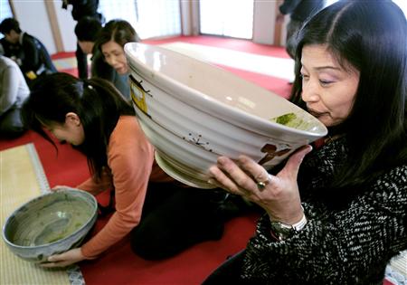 奈良市西大寺1月15日举行了新春传统活动“大茶盛”,用足以装得下整张人脸的特大茶碗沏出抹茶招待游客,别具一番情趣。