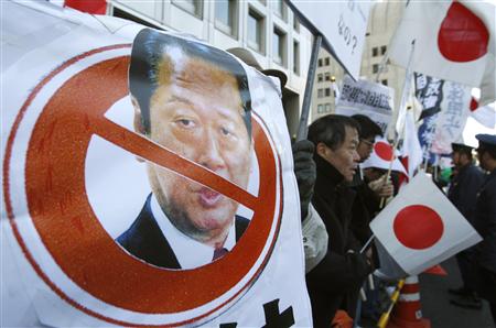 抗议者在民主党总部前集会,反对小泽一郎继续竞选参院议员。