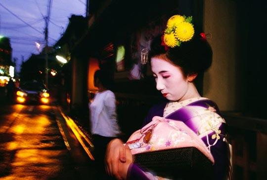 祗园的艺伎。艺伎梳传统发式,着传统和服,脸上涂厚厚白粉。