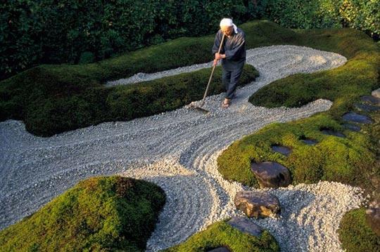 瑞峰院的一名僧侣将砂砾铺在花园中。