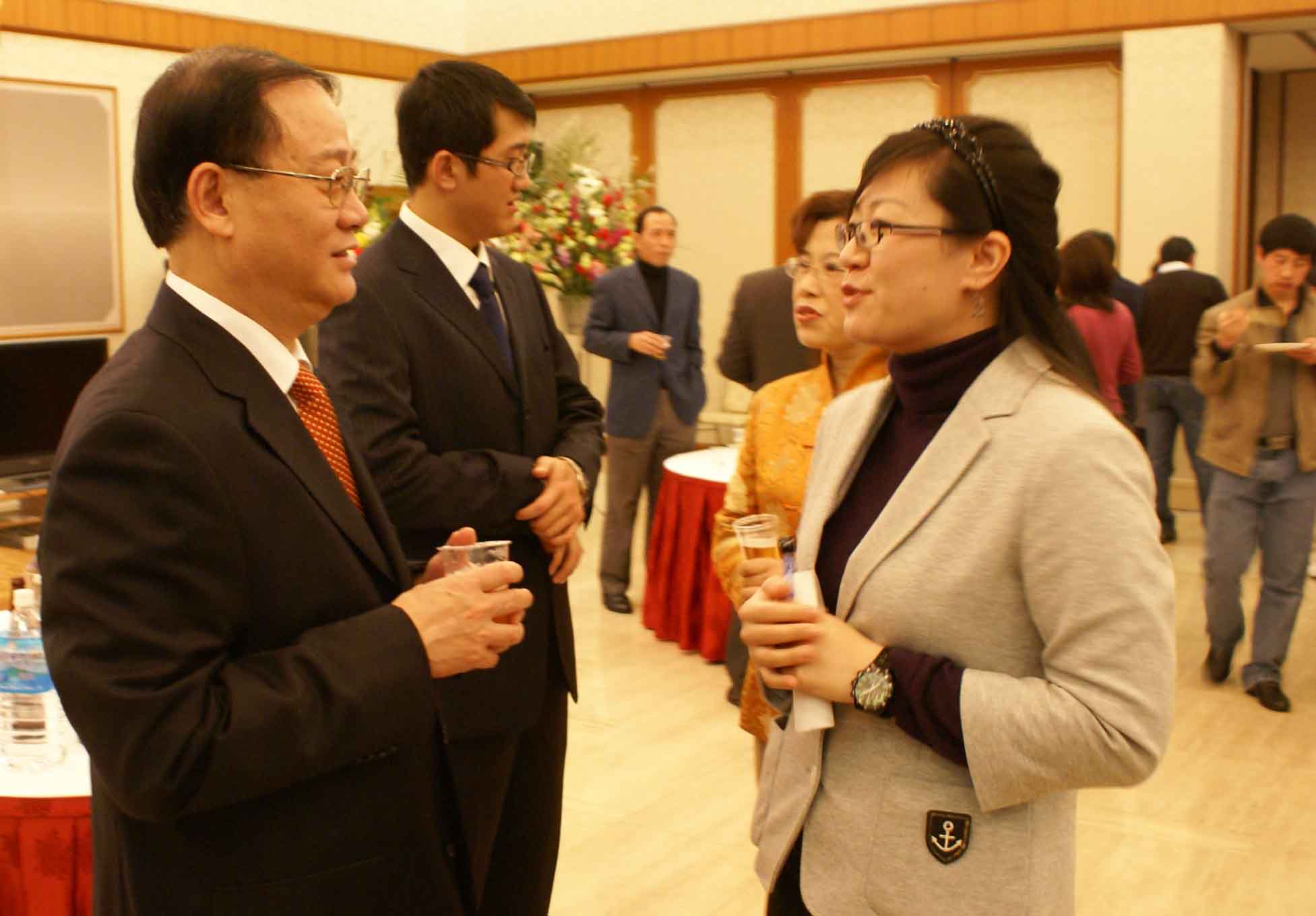 联欢会上,武树民总领事与留学生亲切交谈(左),了解他们的学习生活状况。