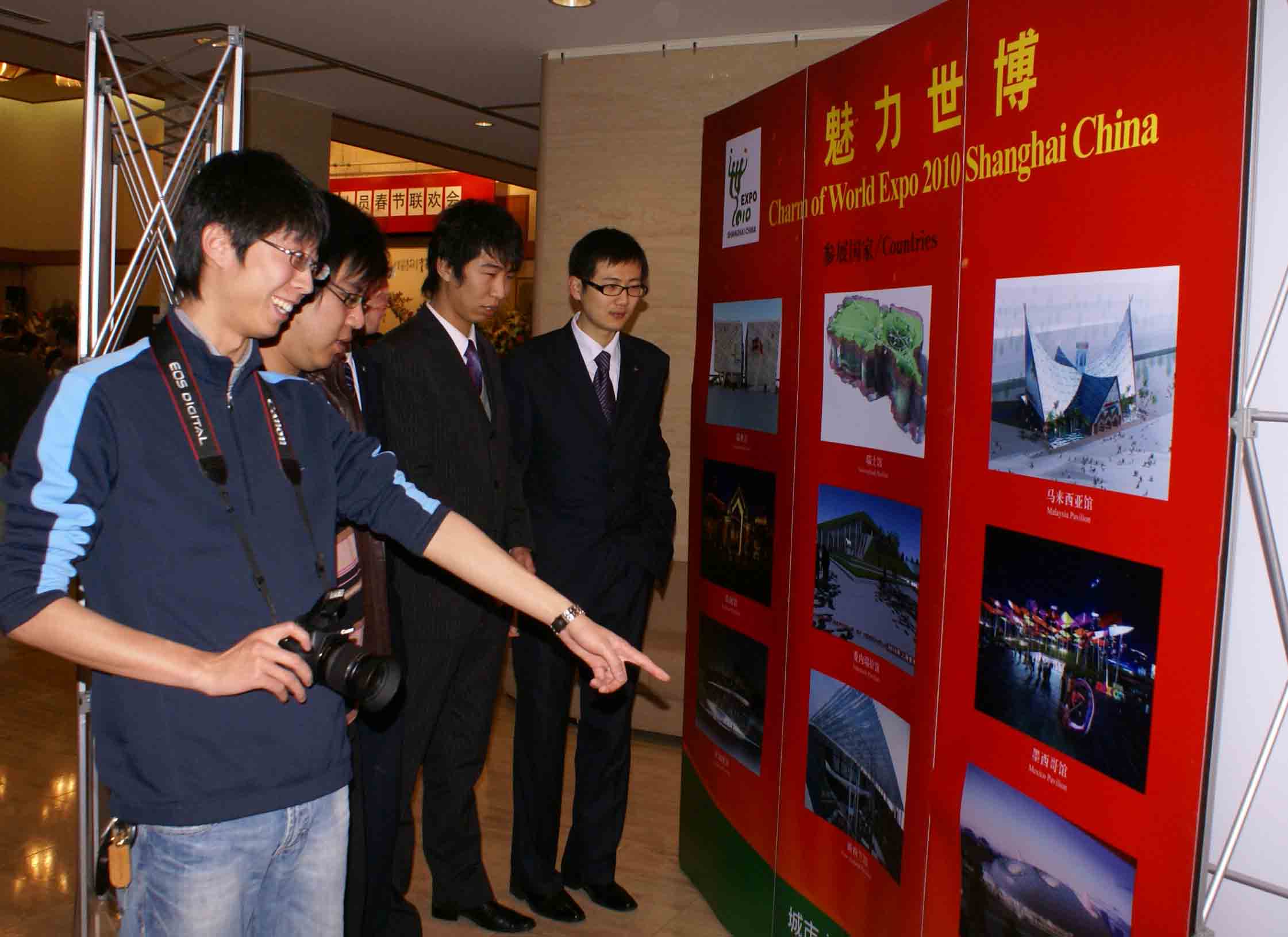 留学生们(右)还饶有兴致地参观了总领事馆内正在举办的上海世博会图片展。(日本新华侨报网图片)