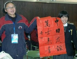 中国浙江省余姚市舜水中学的同学(左)将写有“中日友谊,