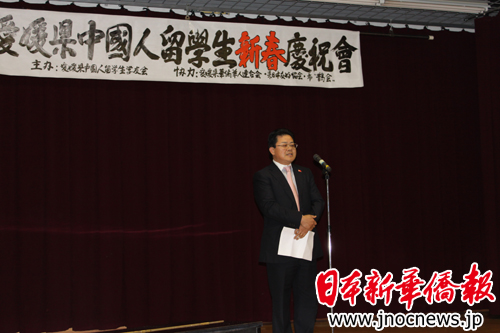 爱媛县中国留学生学友会新任会长李庆吉在晚会开始时向到会的嘉宾致辞,
