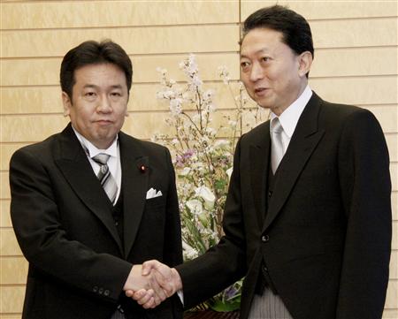 日本首相鸠山由纪夫任命民主党前政调会长枝野幸男(左)为新的行政刷新担当相。