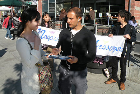 2月10日,来自日本长崎市“万名高中生签名活动执委会”的3名高中生在美国街头,开展了呼吁废除核武器的万人签名活动。