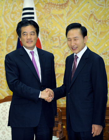 韩国总统李明博(右)会见来访的日本外相冈田克也。