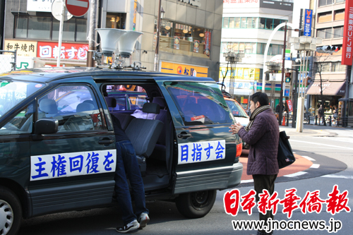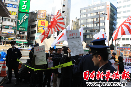 与今年1月10日的骚扰活动的套数基本一样。这些右翼分子先是讲演,内容还是反对民主党的移民政策、反对国会即将审议的具有永住权的外国人参政案,反对“东京中华街”建设构想,攻击中国的政治体制、少数民族政策和国家领导人。然后就是高喊口号,诸如“让中国人滚回去”等等。接着,就是到“阳光城”物产店马路对过,声嘶力竭地喊几句口号,愤怒地质问“阳光城”物产店里面的中国员工为什么对着他们发笑。这时,记者感到他们不懂什么叫蔑视。