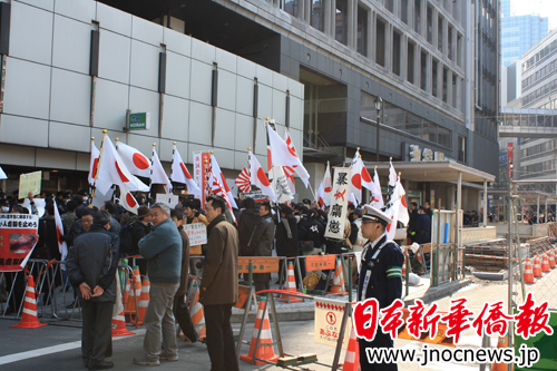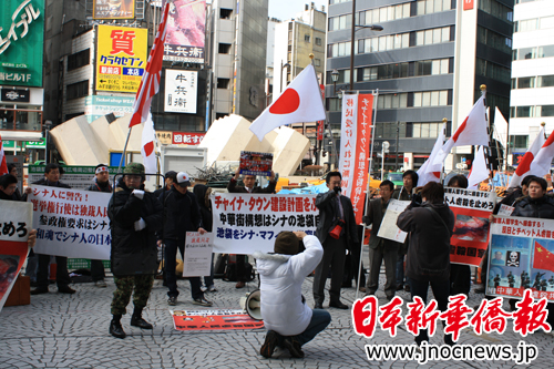 右翼分子于2月14日中午12点钟聚集在池袋车站西口的警岗前面,
