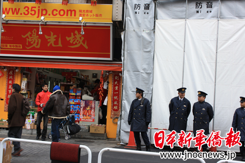 日本警员早早地来到“阳光城”物产店前,捆扎路障,做好防护的准备。(摄影:蒋丰)