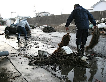 宫城县南三陆町的部分渔民正在清理因海潮而混乱的港口