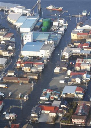岩手县大槌町渔港的海啸高达1.45米,部分街区被水淹没。