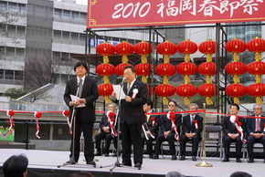 中国驻福冈总领事武树民在“2010年福冈春节庙会”开幕式上致辞指出,本届庙会主办方克服了金融危机带来的资金短缺等困难,集合了广大侨胞的心血和智慧。相信庙会的成功举办必将进一步弘扬中国传统文化,增进福冈市和中国各地人民之间的相互了解和友谊,进一步提升福冈的国际都市形象,提高福冈在中国的知名度。希望更多的中日两国经济界、文化界朋友参与到福冈春节庙会中来,期待庙会能成为福冈展示中华文化的一大品牌。中国驻日本临时代办孔铉佑、自民党福冈县连合会会长新宫松比古、民主党议员古贺一成等也向庙会发来贺电。