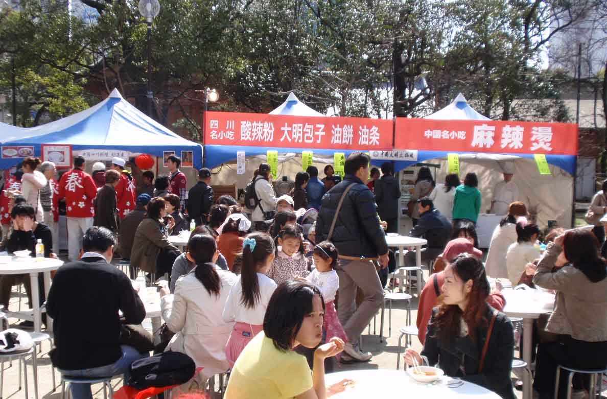 舞台周围的各类中华小吃亦吸引了大批游客前来品尝,水饺、羊肉串、刀削面等具有浓郁中国特色的食品香味扑鼻,令品尝者赞不绝口。闭幕当日正值中国的传统佳节——元宵节,为此煮元宵尤其令人青睐,排队购买的长龙始终蜿蜒在小吃摊前。今年的新增项目炸油条、炸油饼更是供不应求,开幕当天只短短一个多小时就被卖光。卖食品的吆喝声,游客们的欢谈声,舞台前的喝彩声连成一片,使警固公园成了欢乐的海洋,呈现出一派“欢欢喜喜过大年,热热闹闹迎新春”的中华传统庙会景象。前来游园的许多中日朋友都表示,“小吃真好吃,节目真精彩”。上海世博会大型宣传展板和福冈市政府宣传栏也吸引了许多游客驻足观看,为庙会增色不少。
