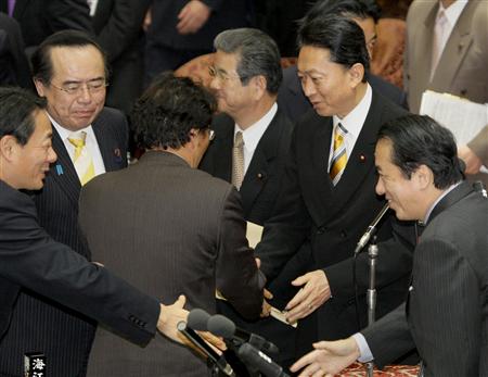 由鸠山内阁提交的2010年财政预算案在国会获得通过,内阁成员相互祝贺