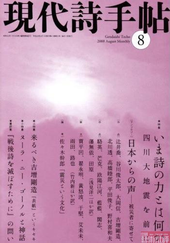 诗言之,诗人更有心志。2009年5月四川汶川大地震后,田原因为与日本诗人谷川俊太郎、思潮社社长小田久郎和北京诗人骆英等共同发起募捐活动,把募捐和征稿启示刊登在日本6月号的《现代诗手帖》上,其题目为“请协助四川大地震灾害救援行动”,呼唤日本的诗歌界给予关注,他也因此在日本文坛有了“汶川募捐诗人”之称。
